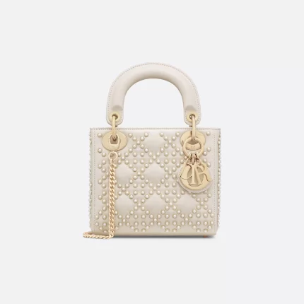 DIOR / MINI LADY DIOR BAG Latte Crinkle-Effect Lambskin with White Resin Half-Pearl Cannage Motif M0505OWFX_M941