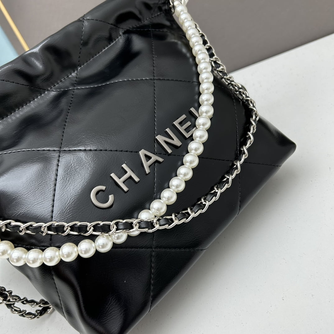 CHANEL Pearl garbage bag black with sliver hardware size: 23*28*22*7cm