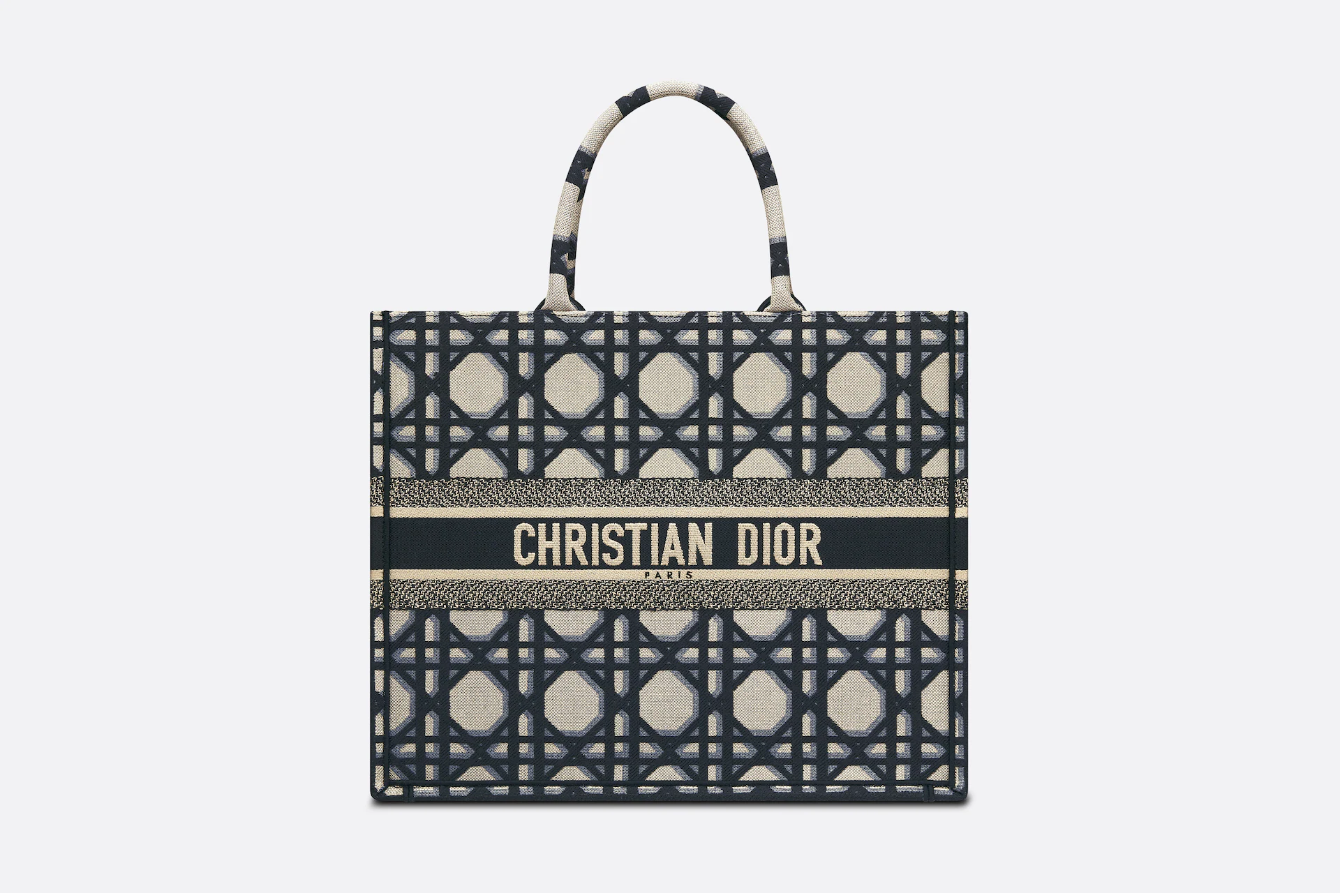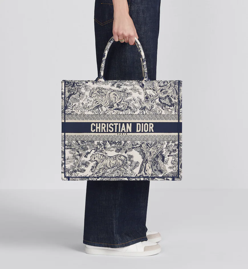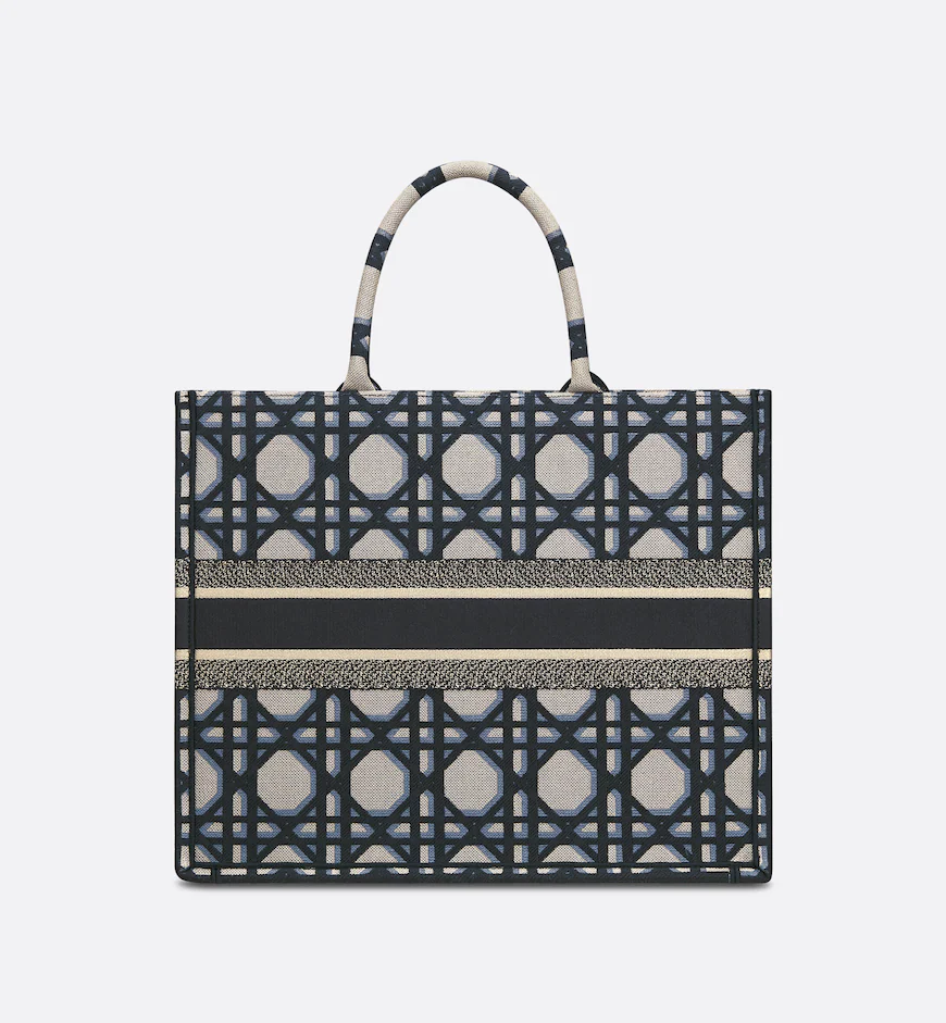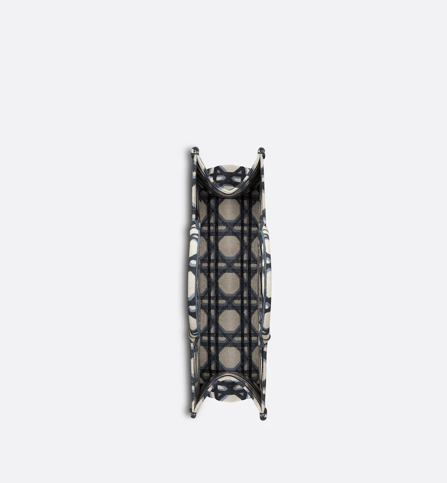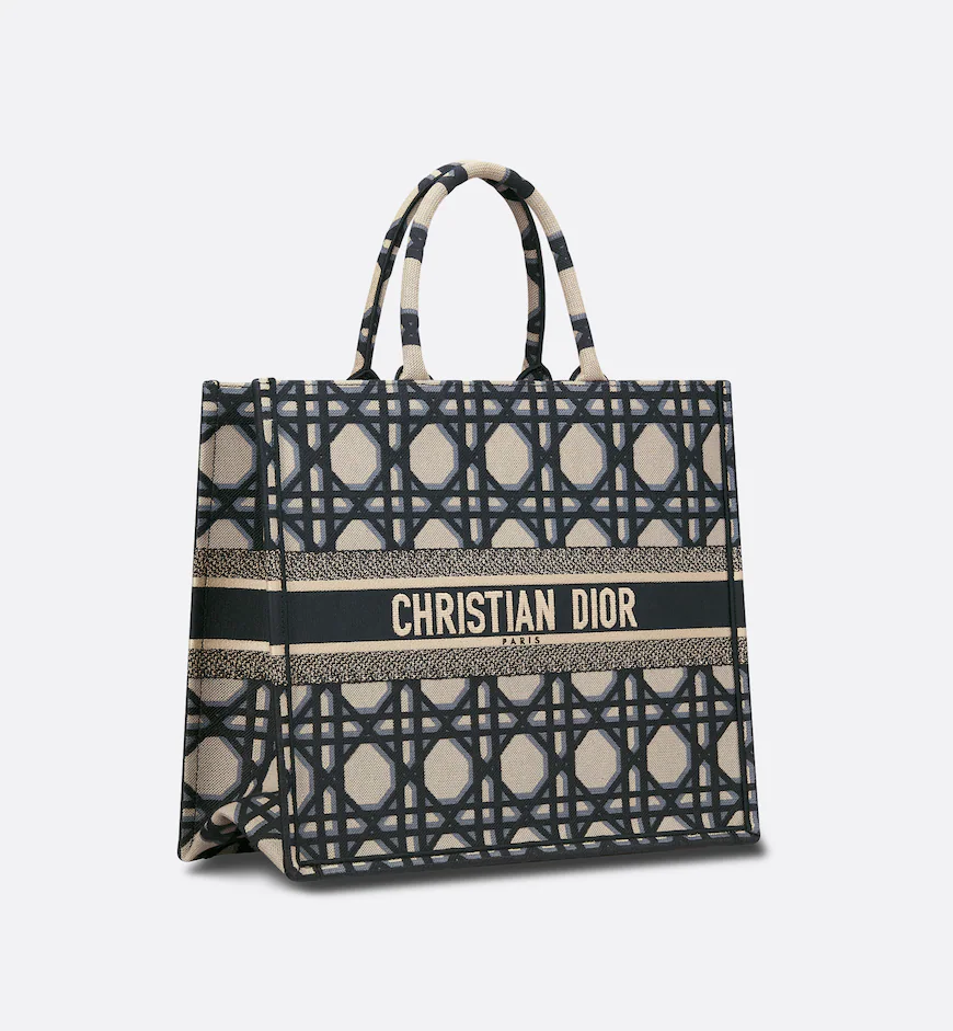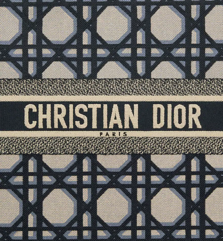 Revealed at the Fall-Winter 2023-2024 fashion show, the Dior Book Tote introduced by Maria Grazia Chiuri, Creative Director of Christian Dior, has become a staple of the Dior aesthetic. Designed to hold all the daily essentials, the style is fully embroidered with the beige and blue Macrocannage motif. Adorned with the Christian Dior Paris signature on the front, the large tote exemplifies the House’s signature savoir-faire and may be carried by hand or worn over the shoulder.