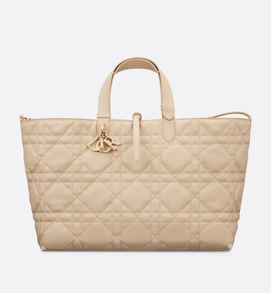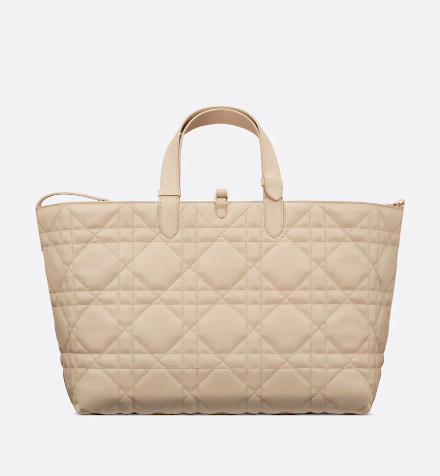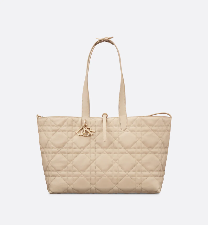 The Dior Toujours bag is distinguished by a casual and practical design. Crafted in powder beige calfskin with Macrocannage topstitching, it showcases a spacious interior compartment with a matching pouch to organize the essentials. Its leather strap closure keeps items secure while the D of the CD Lock closure twists to adjust the sides and enhance the bag’s silhouette. The leather handles can be adjusted using the small notches in order to be able to carry the large bag by hand or wear it over the shoulder.