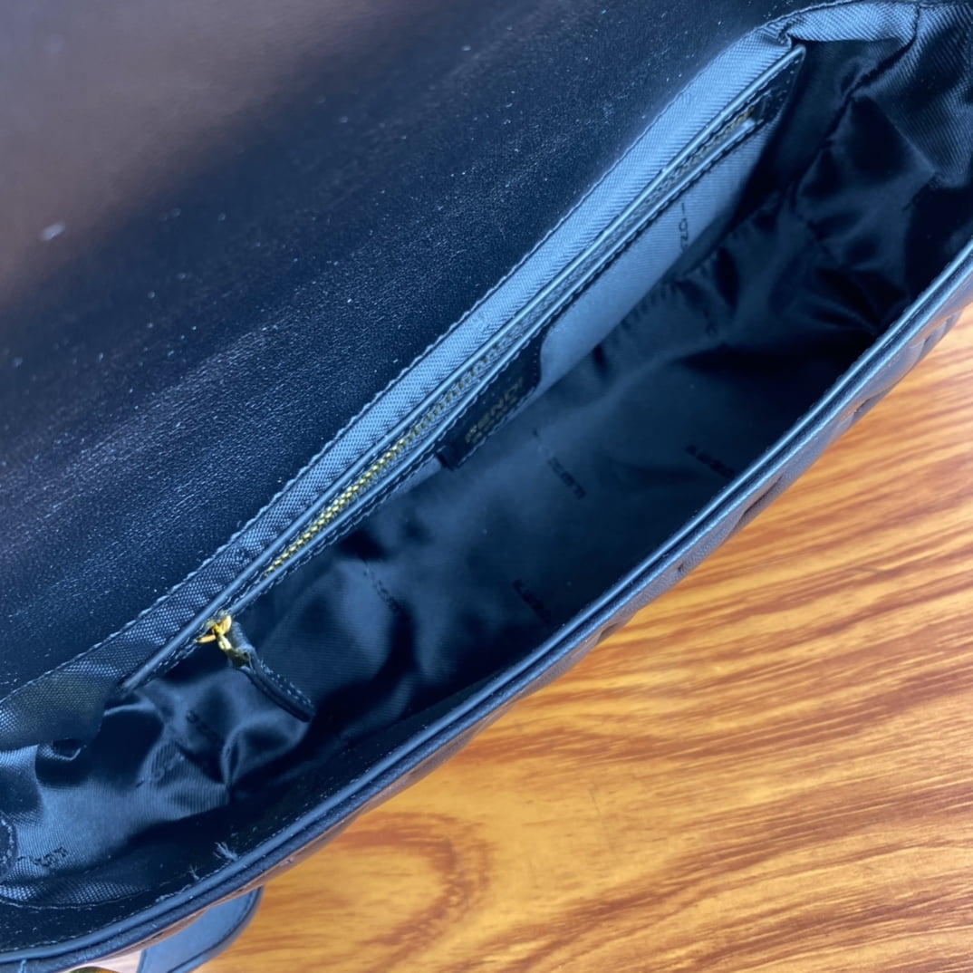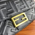 Clamshell magnetic snaps. Equipped with FF magnetic buckle. Lined with zipper bag. With removable shoulder strap, handbag can be shoulder or crossbody. (Sheepskin). Decorated with FF embossed pattern. Gold metal part number F0191
