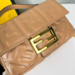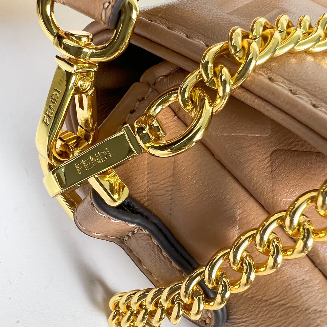 Clamshell magnetic snaps. Equipped with FF magnetic buckle. Lined with zipper bag. With removable shoulder strap, handbag can be shoulder or crossbody. (Sheepskin). Decorated with FF embossed pattern. Gold metal part number F0193