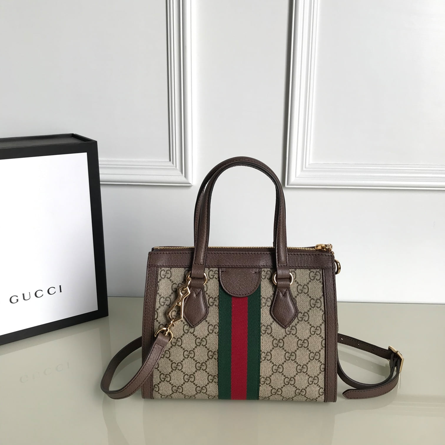 Embellish the brand’s most distinctive classic elements such as red and green webbing, reflecting the tribute to the brand’s equestrian origins. Model :547551, color: brown rubber, size: w25*h19*d9.5