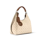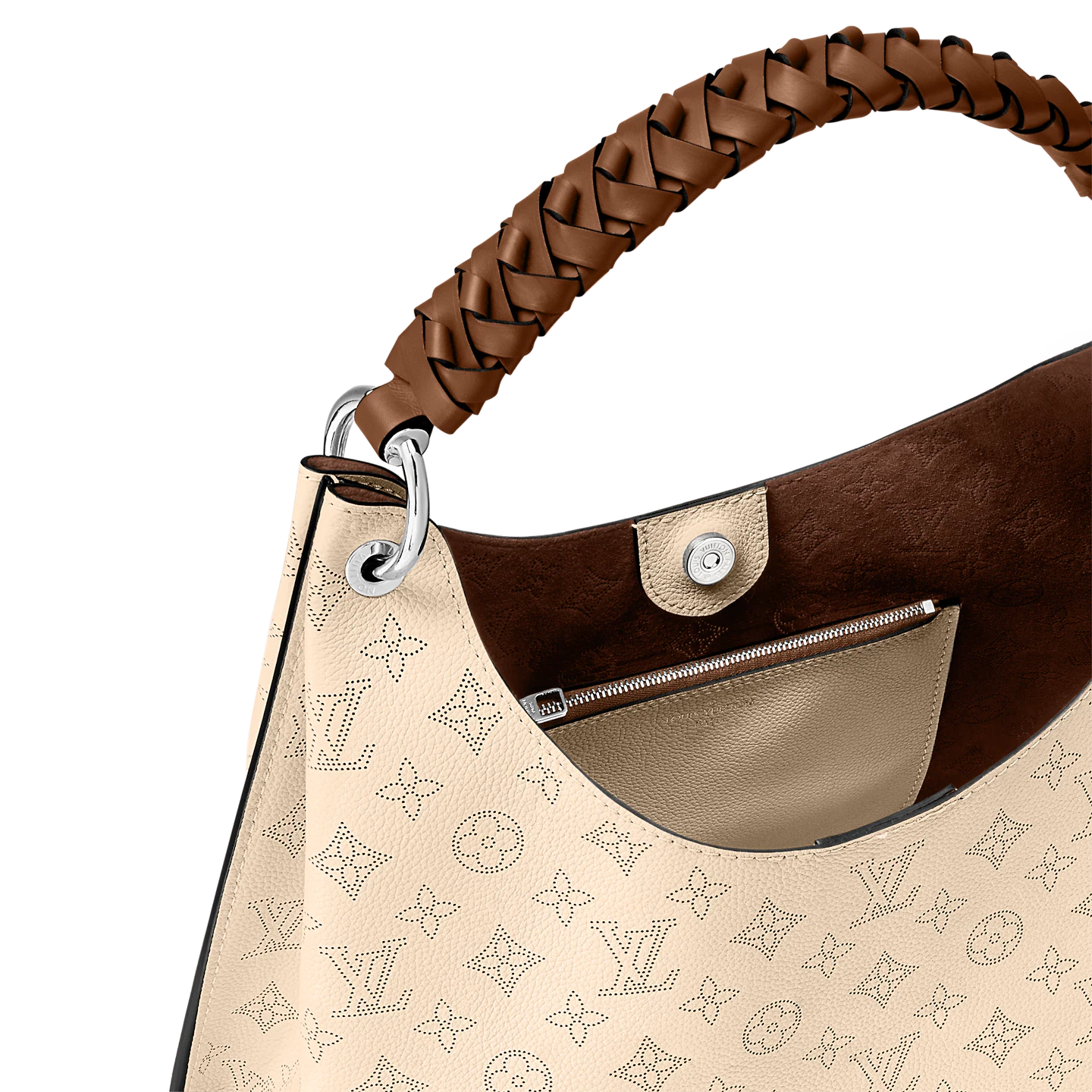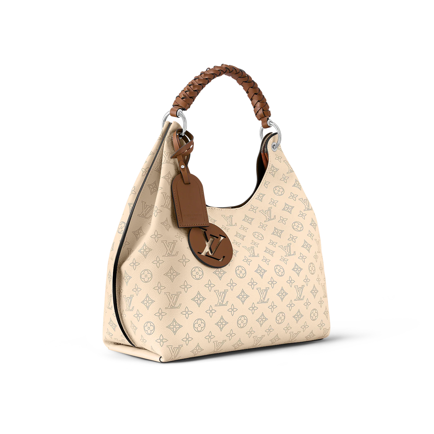 The Carmel hobo bag is a spacious. lightweight style in Mahina calf leather with Monogram perforations. The supple leather and the soft form of the bag combine to make it exceptionally pleasant to carry. Craft details such as the braided handle and LV leather charm add to the sophistication of this model.