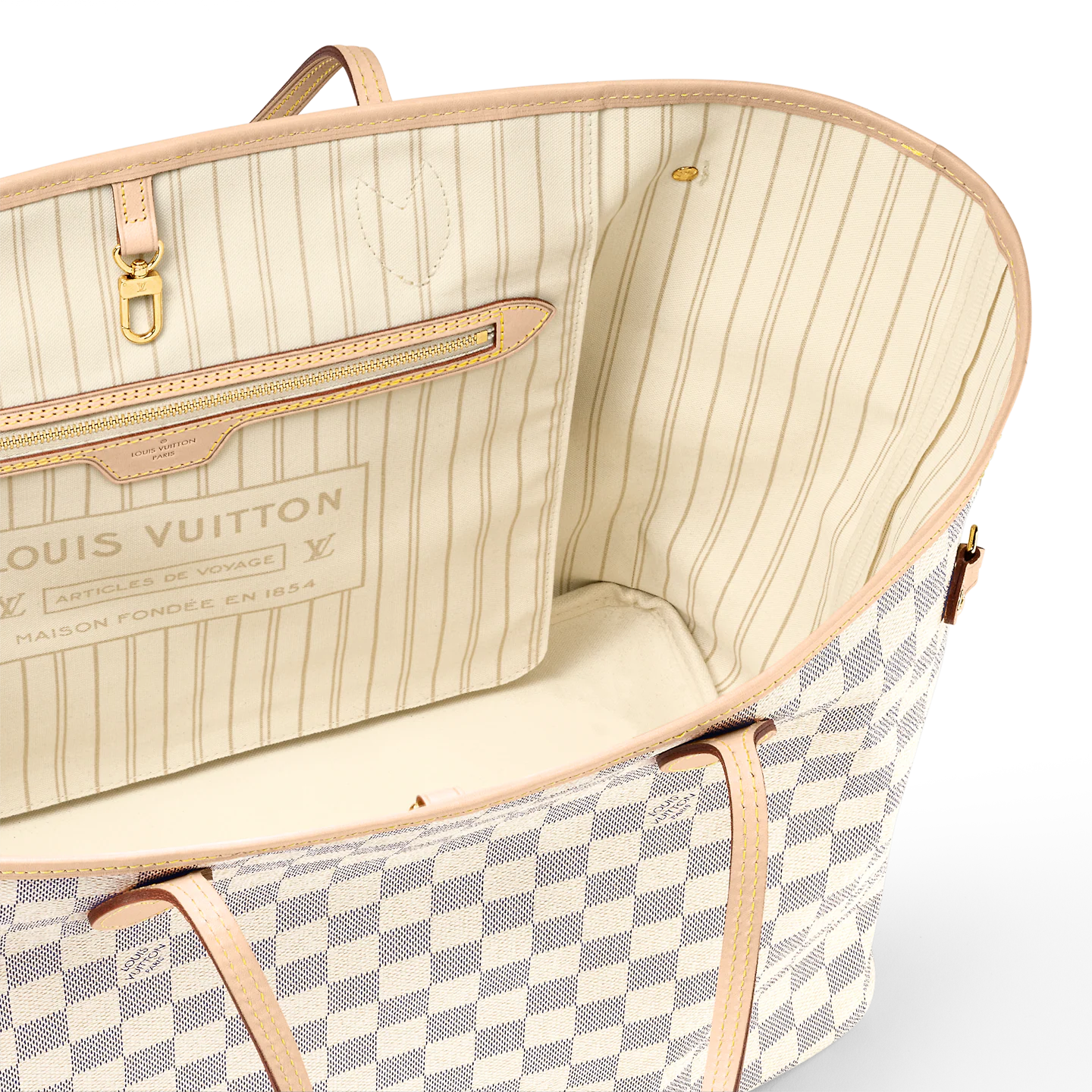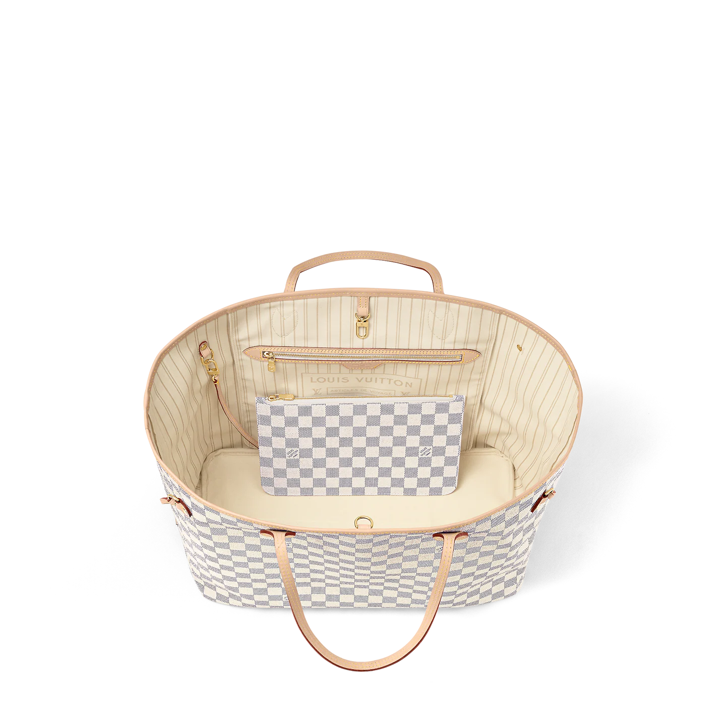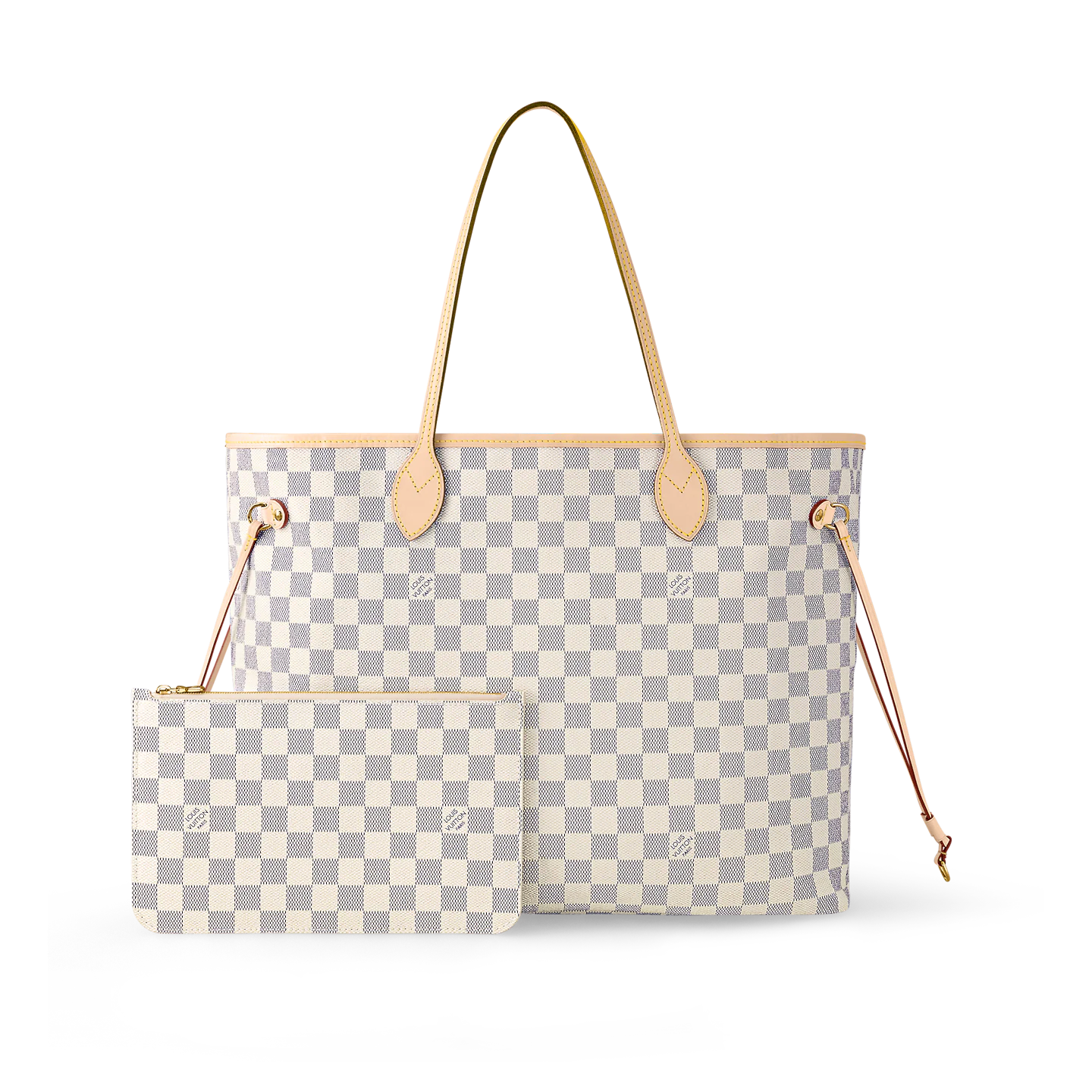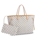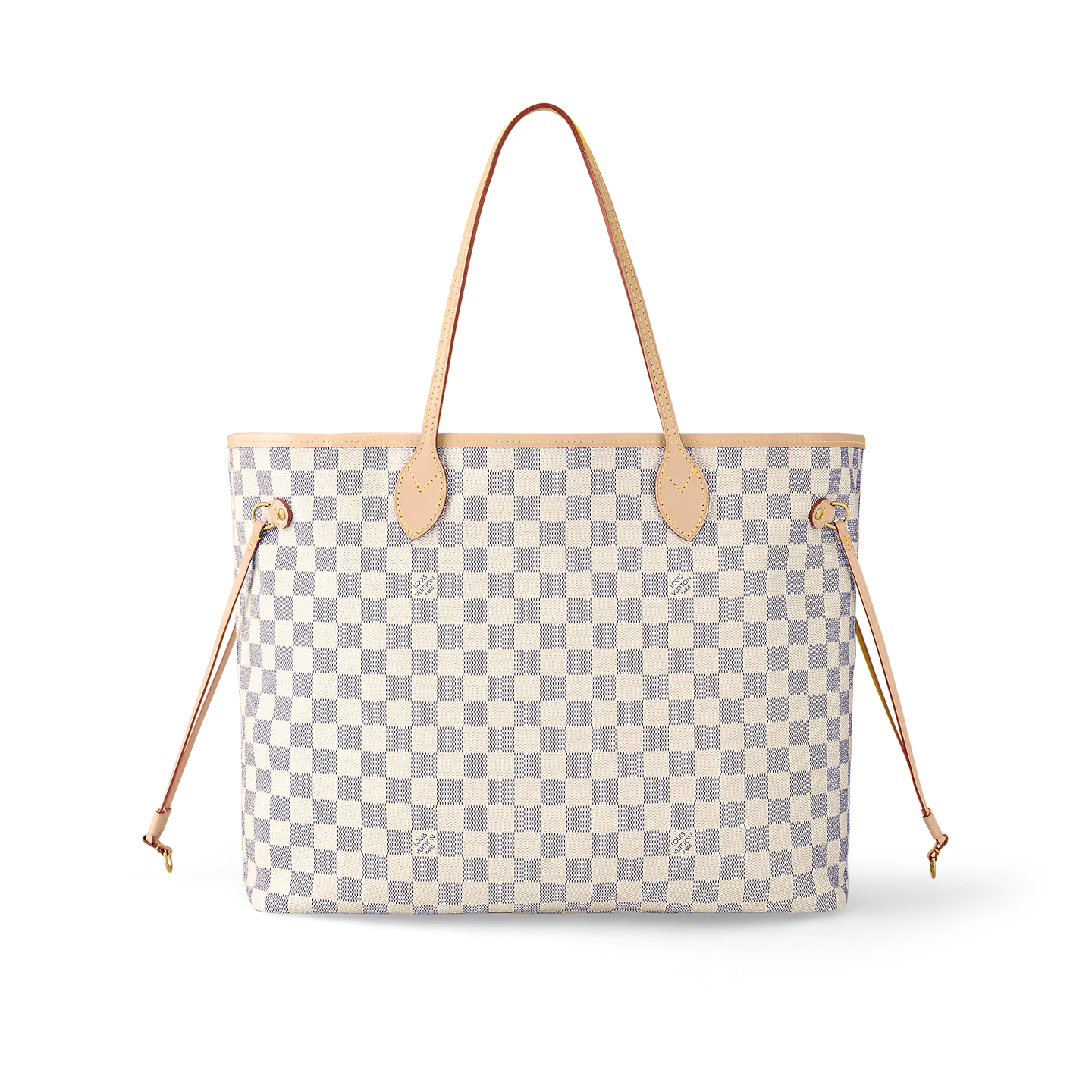 The Neverfull MM tote unites timeless design with heritage details. Made from fresh Damier Azur canvas with natural cowhide trim.