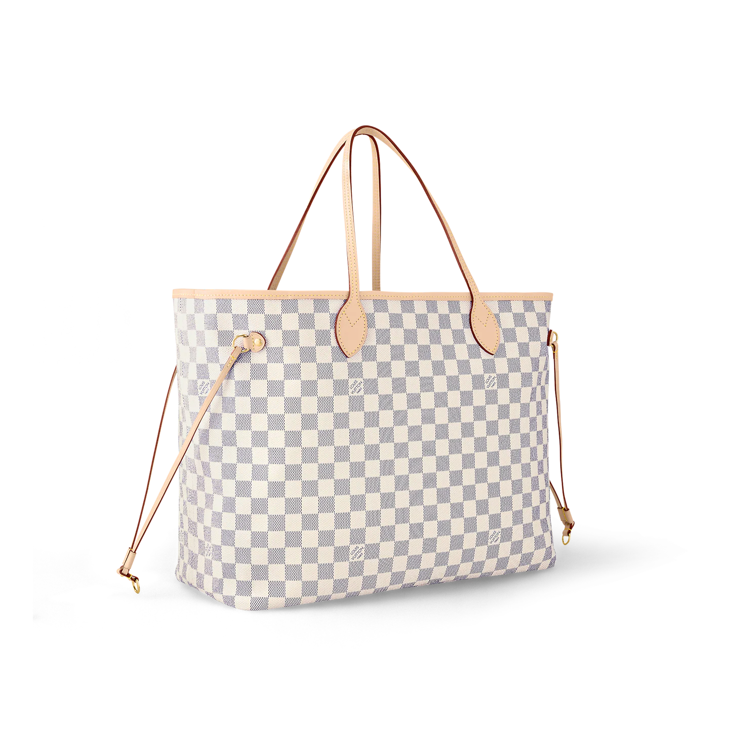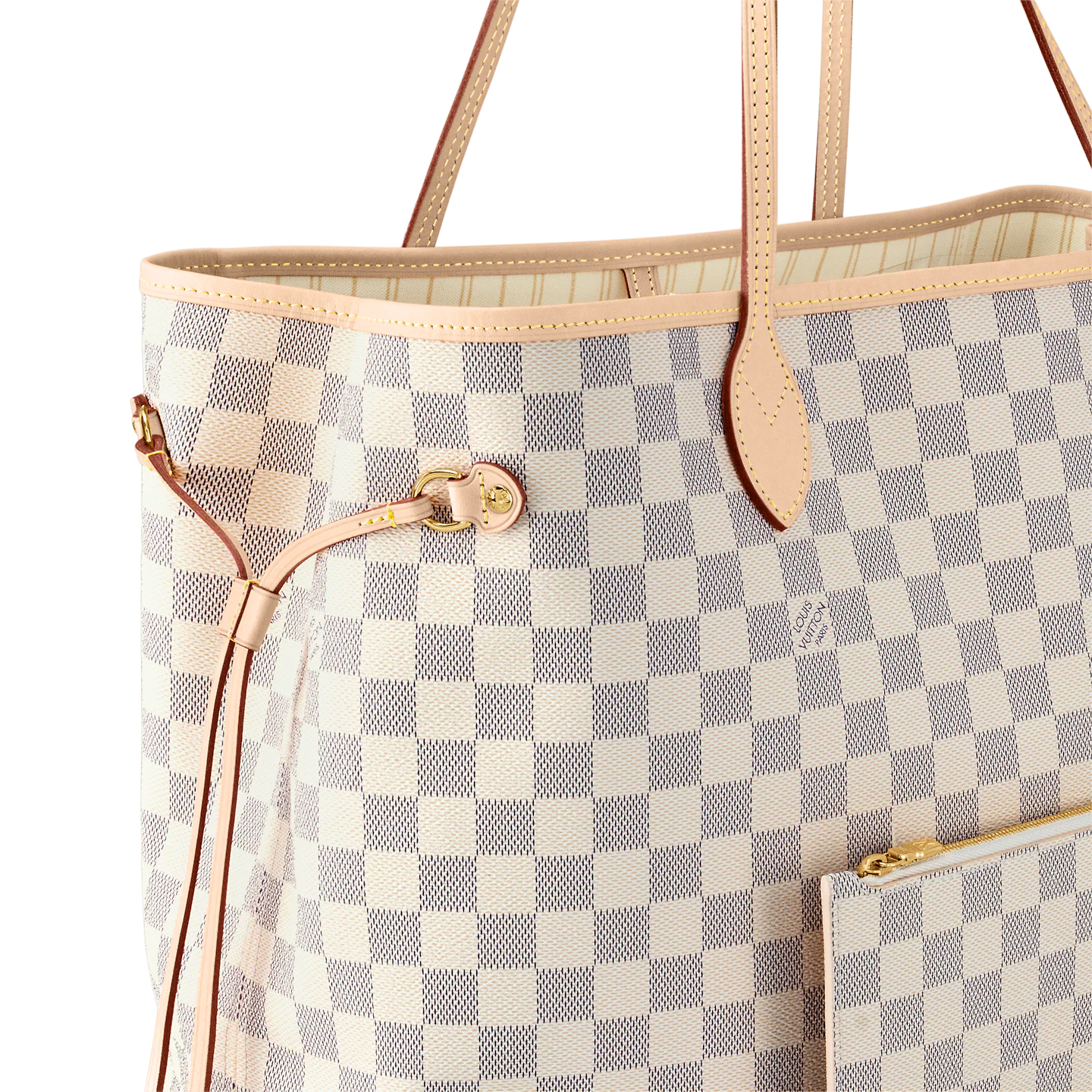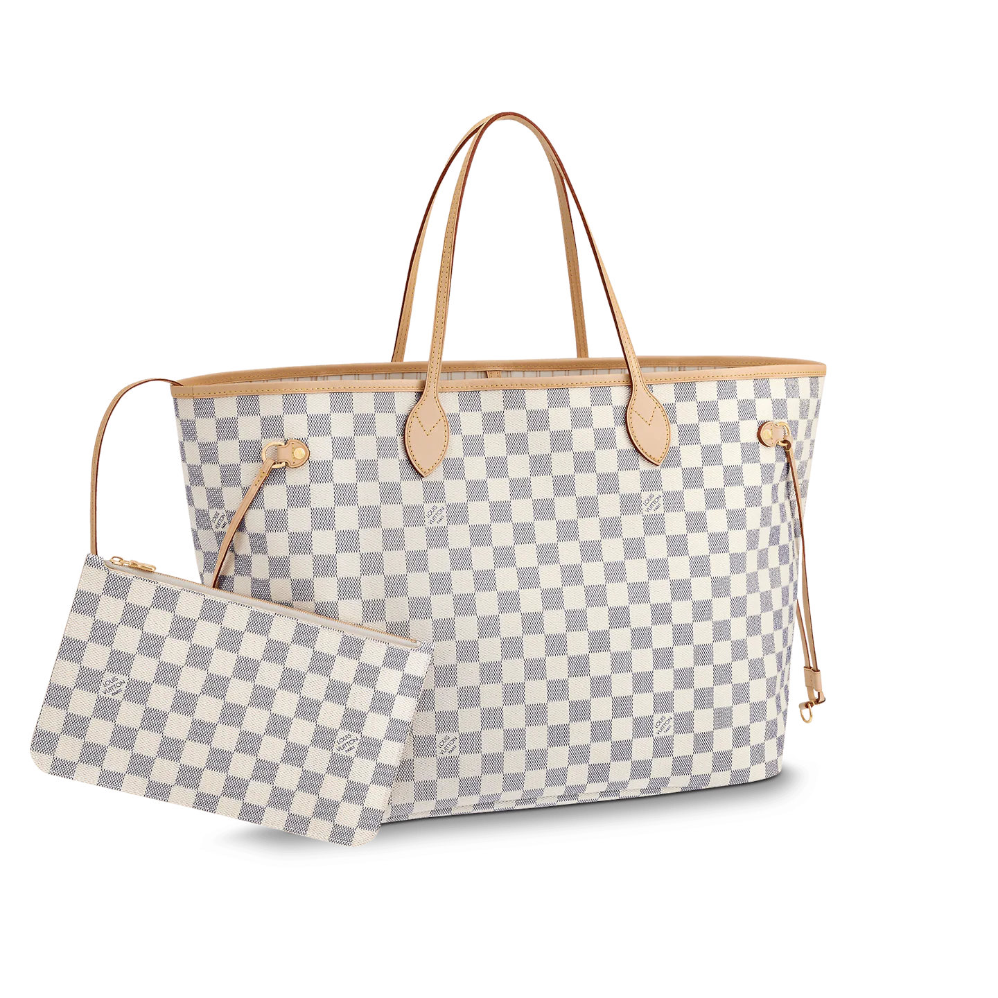 The Neverfull GM tote unites timeless design with heritage details. Crafted from fresh Damier Azur canvas with natural cowhide trim. it is ultra-roomy yet never bulky. with side laces that cinch for a sleek allure or loosen for a more casual look. Slim. comfortable handles slip easily over the shoulder or arm. Lined in colorful textile. it features a removable pouch which can serve as a clutch or an extra pocket.