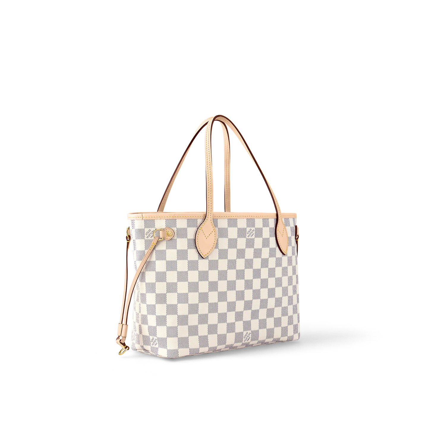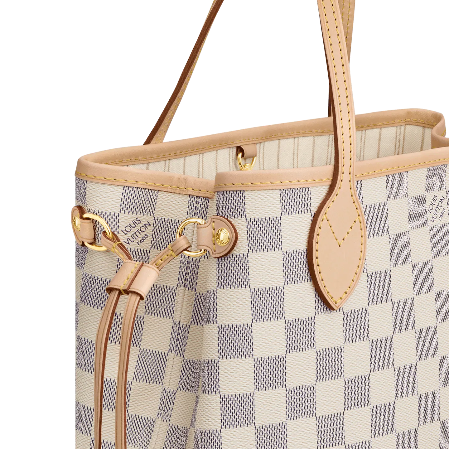 The Neverfull PM tote pairs timeless design with heritage details. Crafted from Damier Azur canvas with natural cowhide trim. it is capacious yet not bulky. with side laces that cinch for a sleek allure or loosen for a casual look. Slim. comfortable handles slip easily over the shoulder or arm. Lined in colorful textile. it features a removable pouch which can be used as a clutch or an extra pocket.