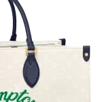Emblazoned with the name of a favorite holiday destination. this Hamptons edition of the OnTheGo GM tote is the ideal companion for summer getaways. Made from tone-on-tone Monogram jacquard canvas enhanced with colorful tufted embroidery and an LV Circle emblem. it is fitted with contrasting leather handles and long shoulder straps for a range of chic carry styles.
