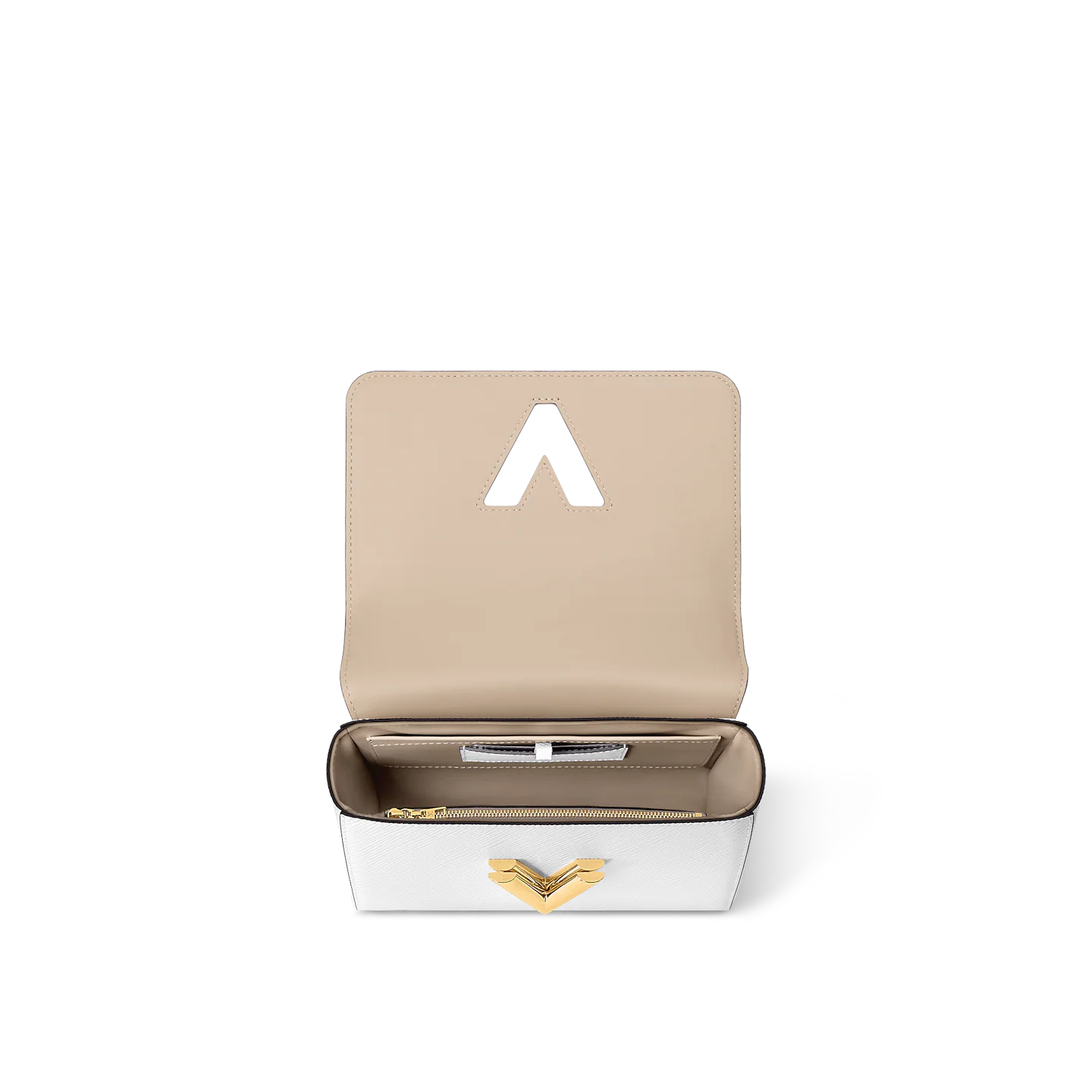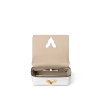 The Twist MM handbag looks stunning in white calfskin with a gold-color LV Twist lock and a leather charm inspired by the street signs of Paris. The detachable strap is in the same colorway as the charm and features “Louis Vuitton Paris” in white lettering. A removable leather top-handle gives another carry option.