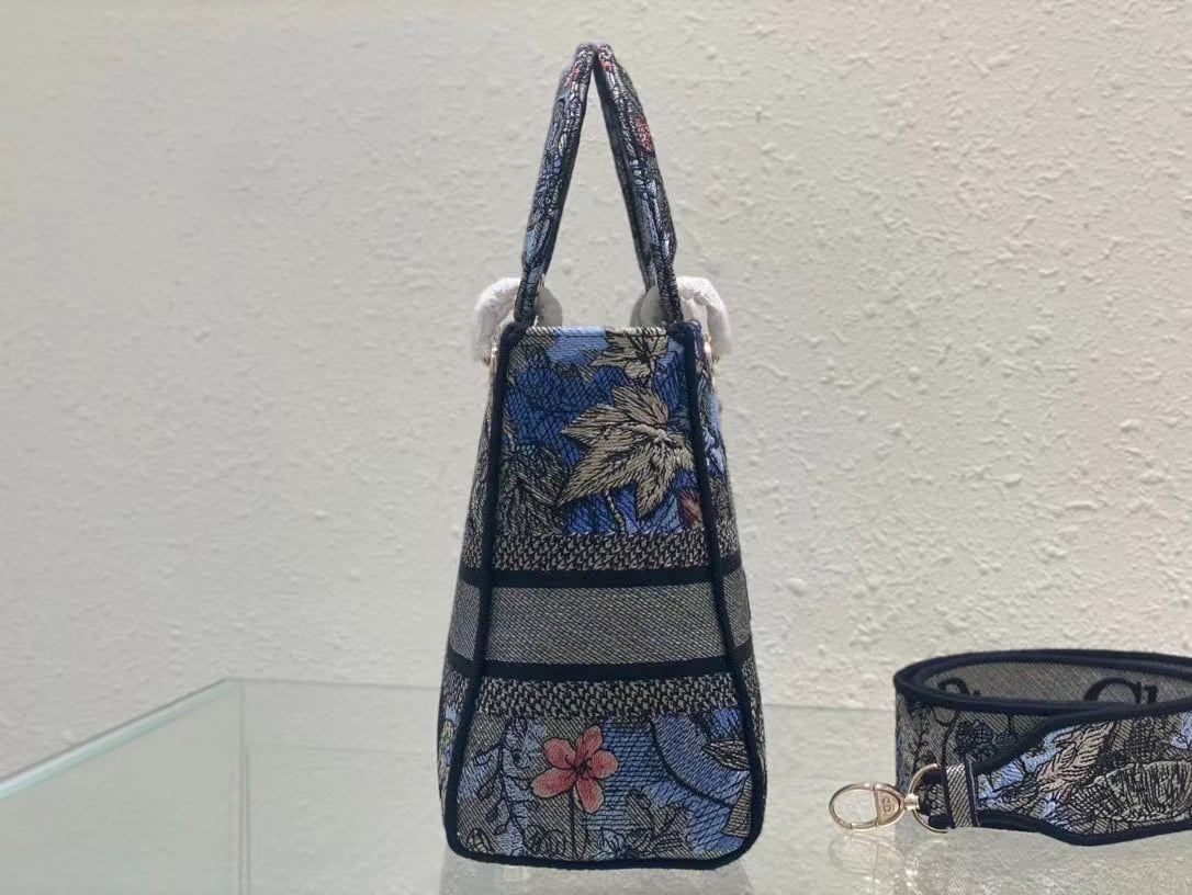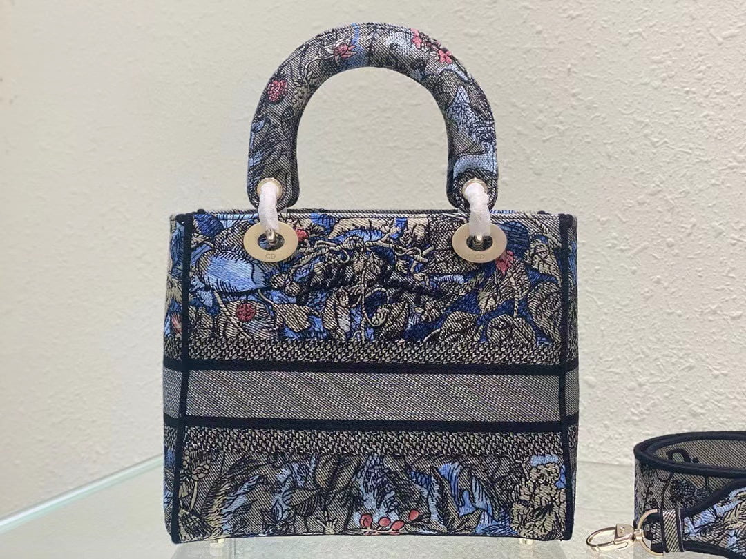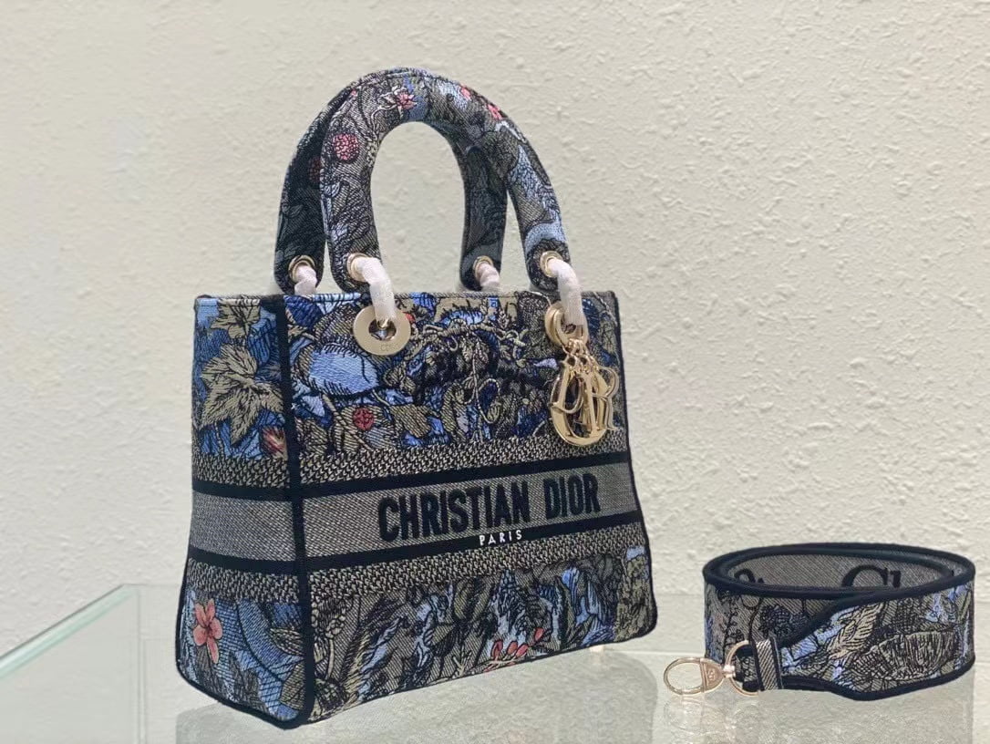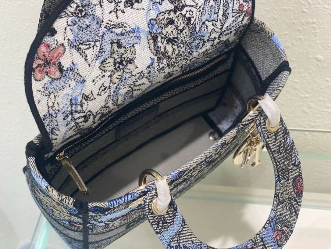 The five-compartment embroidered Magic Garden handbag combines classic elegance with a stylish look. Crafted in denim fabric, the entire body is decorated with multi-coloured diorjardinmagique pattern embroidery, drawing inspiration from the wizarding world to display charming pastoral patterns. The front is decorated with the christian dior paris logo, and the light gold finish metal di.or pendant raises the tone and adds a touch of inspiration to the exquisite silhouette. Medium style with detachable double-sided embroidered wide shoulder strap, portable or crossbody. Dimensions :24x20x11 cm
